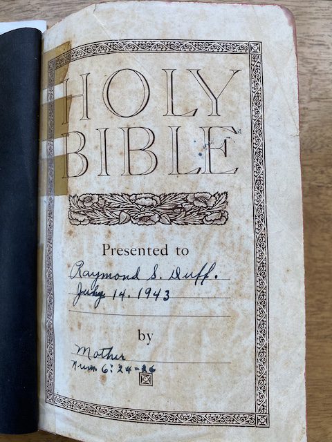 While reading at the Open Mic, I anticipated the benediction to come in the last paragraph: “The last memento I received was my father’s Bible. He’d left his Bible to my elder sister, but years later, while cleaning out her house, she sent it to me in recognition of my faith. I had the tattered Bible restored with explicit instructions to retain the front page: Holy Bible, Presented to Raymond S. DuffJuly 14, 1943 by Mother, below which my grandmother wrote Num. 6:24-26. At the top of that page in Numbers, she wrote Benediction, and my father underlined the verses and drew three parentheses to the right of them.” My father carried his Bible with him when he reported for duty in WWII and for the rest of his life.